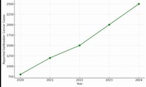 Graph showing the increase in gallbladder cancer cases [both domestic and international patients] in India from 2020 to 2024. This upward trend reflects the growing impact of various contributing factors like better detection, environmental carcinogens, and lifestyle changes.